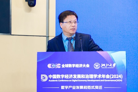 中国社会科学院大学教授江小涓、哈佛商学院终身教授朱峰、浙江大学副校长黄先海、清华大学苏世民书院院长薛澜分别作题为“数据的经济学分析:要素、产业与市场”“数字平台与生态伙伴的竞合关系”“数字贸易平台与中国创新变革”“人工智能发展的治理挑战”的主旨报告。