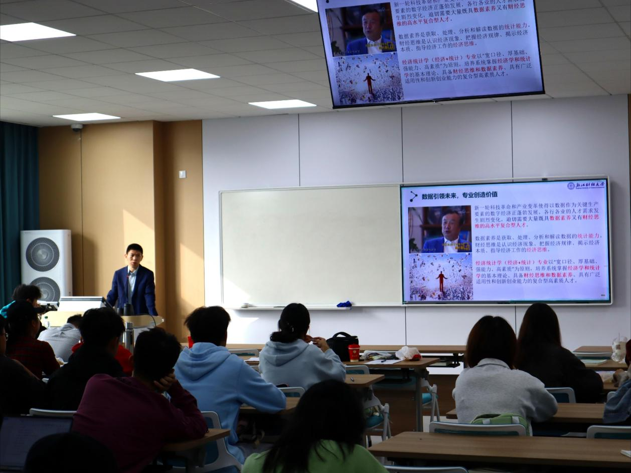 刘波老师以“国家级一流本科专业——经济统计学”为主题,从当今时代潮流出发,引出经济统计学的重要性。刘老师围绕“专业发展历程”、“师资队伍”、“专业优势”、“专业发展前景”与“课程融合模式”这几个方面进行解读,并介绍了经济统计学的专业特色与“三融协同”的人才培养模式。刘老师深入浅出的讲解,让同学们对经济统计学专业有了更清晰的认知,激发大家对经济统计学的兴趣。