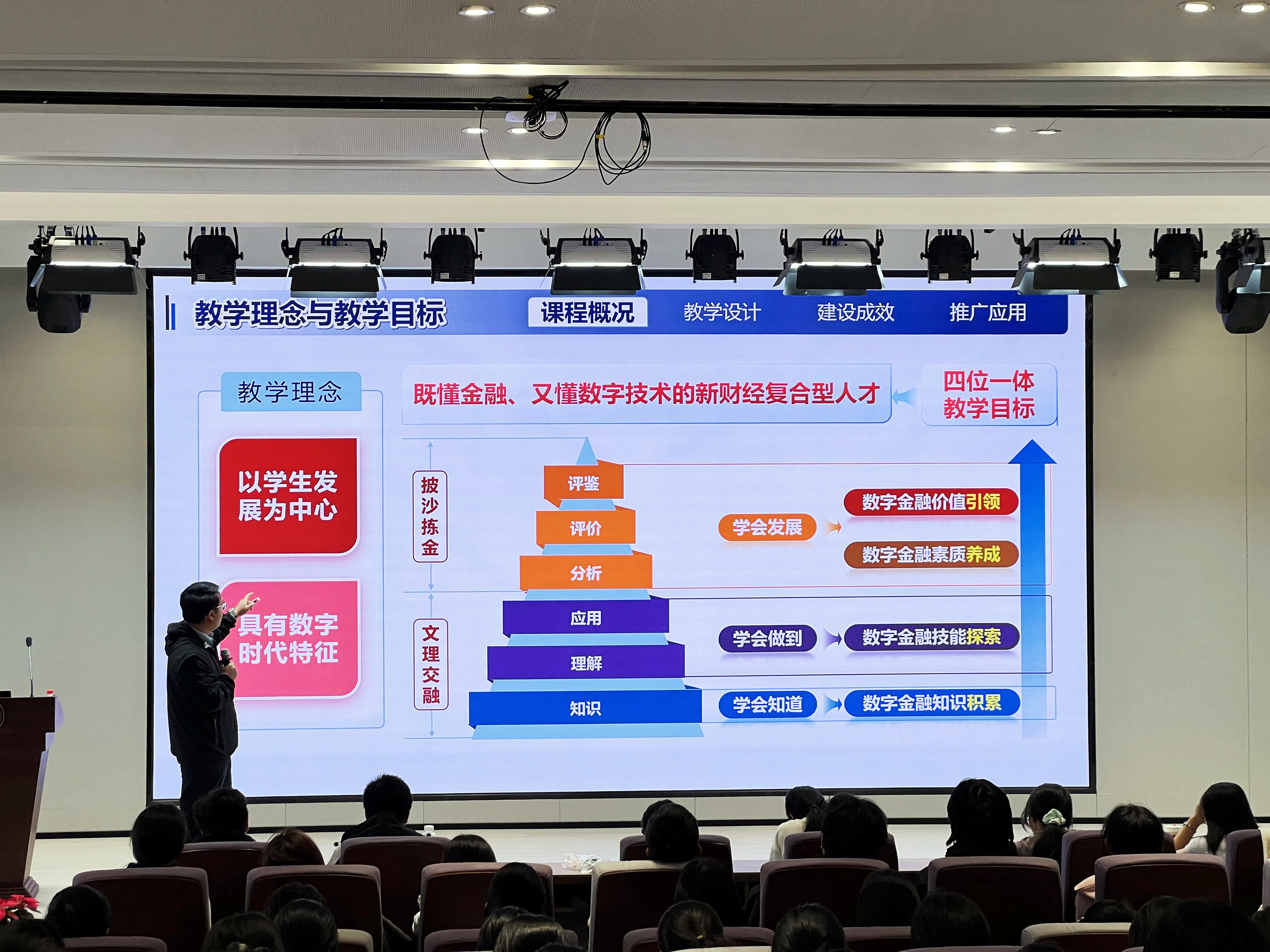 随后,金骋路从三个维度系统重构了同学们对金融学的理解:首先,他深入剖析了金融学的时代使命,指出数智金融的普惠性、创新性与协同性,正深刻契合中国经济的转型需求,推动着金融从专业领域走向民生服务。其次,针对同学们普遍困惑的知识体系构建问题,他揭示了传统教学中存在的知识断层、跨学科融合不足、批判思维欠缺等关键问题,并提出“金融向善”的价值导向。最后,他以“数字金融”课程为例,详细阐释了“双链融通”的创新路径——通过“四阶递进”的内容链和“三式问题”的项目链,配合三维评价机制,为同学们描绘了新时代金融人才的能力图谱。