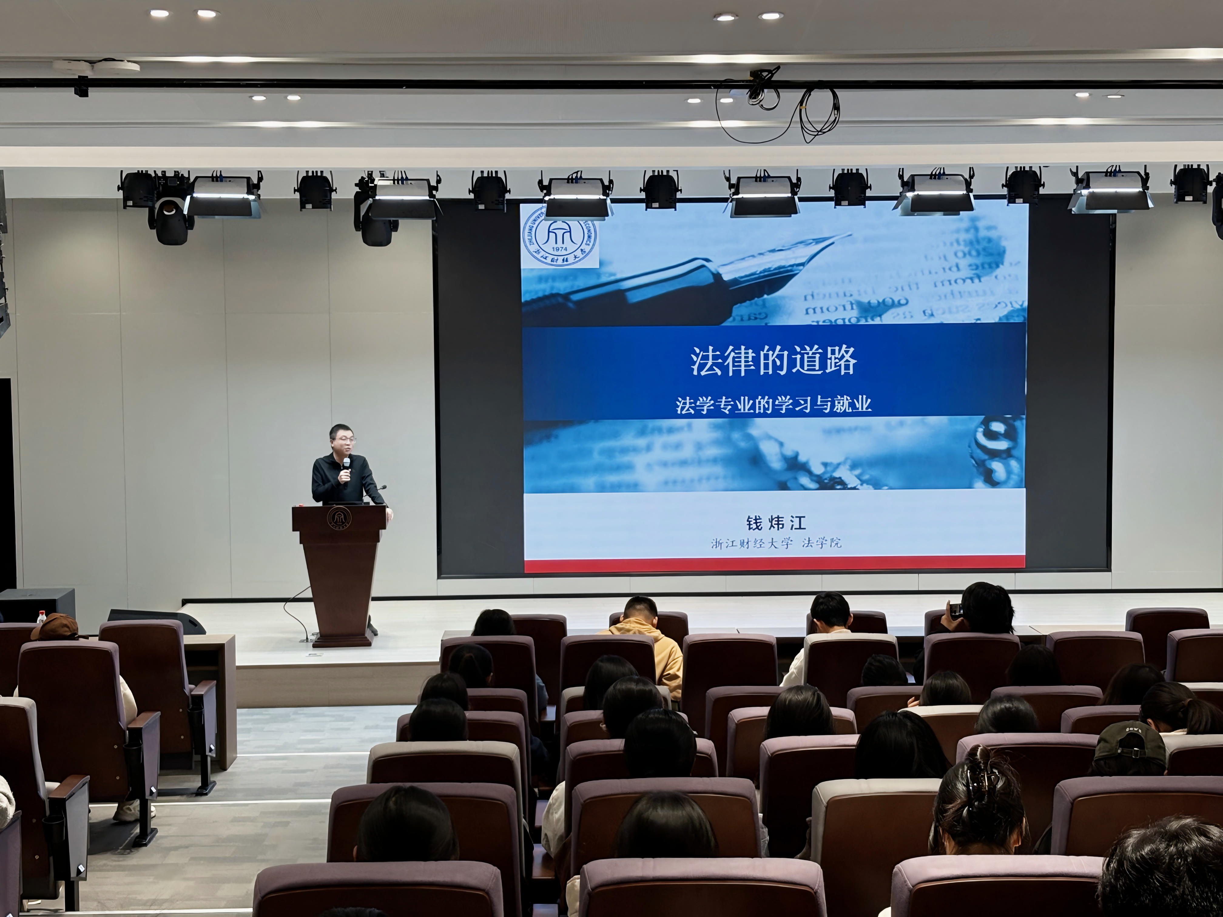11月30日,学院邀请法学院名师钱炜江做客“专业开讲啦”第二期,钱炜江老师以“法律的道路:法学专业的学习与就业”为主题展开专题分享,从专业价值锚定到学习方法拆解,再到就业前景研判,层层剖析法学专业的核心逻辑,本次讲座由学院执行院长叶舟主持,数智法学拔尖班执行主任冯姣及2025 级全体学生到场聆听。