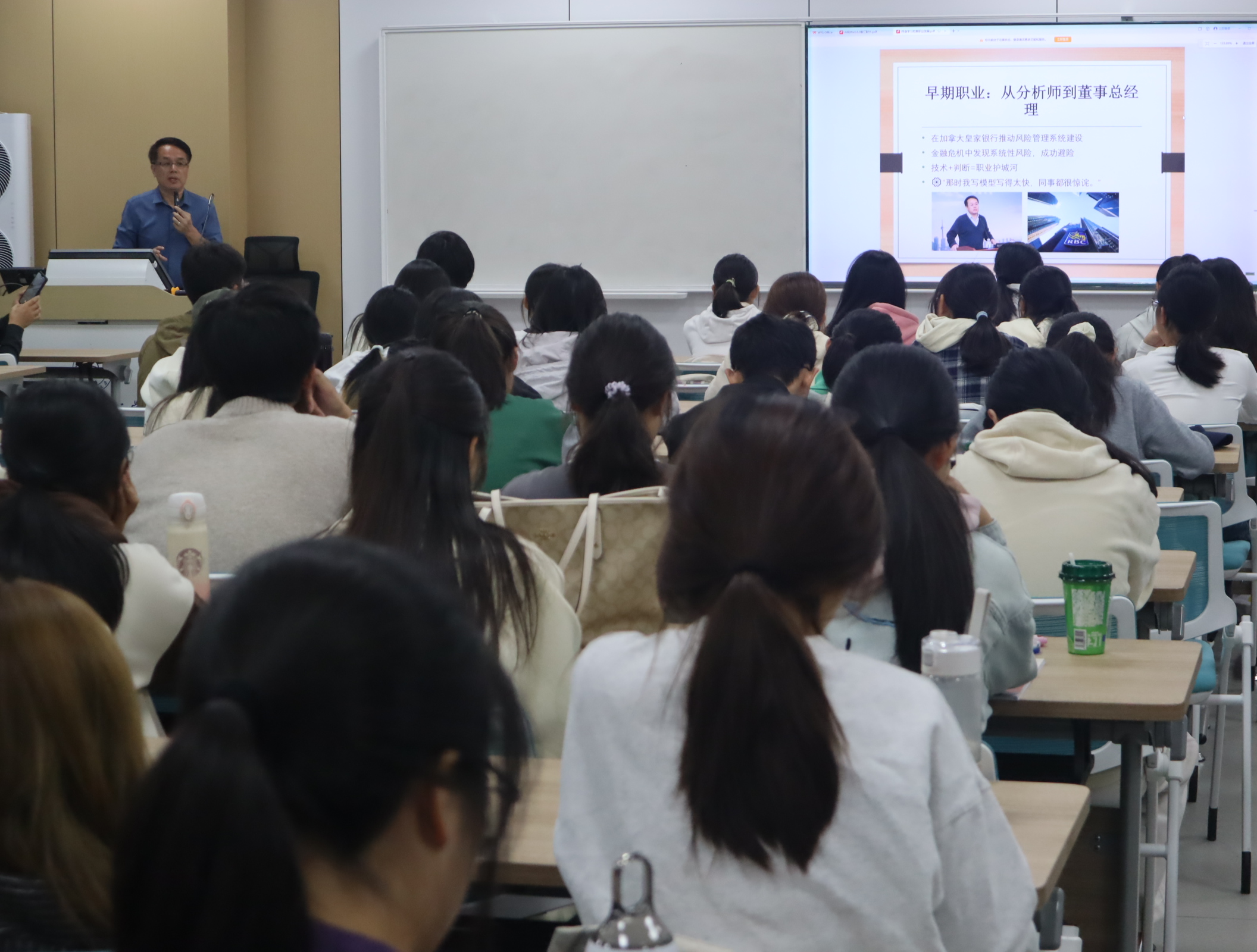 讲座伊始,王勇教授回顾了从西安交通大学到加拿大达尔豪斯大学攻读数学博士的学术经历。他坦言,从研究微分方程到构建金融模型,看似跨界,实则是底层逻辑的贯通。数学思维为金融实践提供了坚实基础,也成为他践行“终身学习”理念的真实写照。他结合翻译约翰.赫尔的经典著作《期权、期货及其他衍生品》的经历,指出“翻译是最好的学习”,在字斟句酌中深化专业认知;他强调“带问题去学习”是研究生阶段的核心能力,鼓励学生在主动探索中构建知识体系;同时提倡“读原文、看前沿、用AI做学习伙伴”,在人工智能时代打造高效的学习模式。